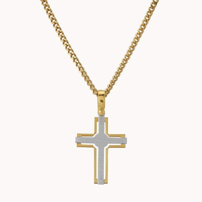 This classic cross pendant is made from solid Sterling Silver with its shape derived from the traditional cross shape. Exceptionally made to the highest quality, the cross itself has been finished with a lovely sateen brushed finish. The outer border is polished and has been plated with a premium layer of real yellow gold plating to create a wonderful two-tone finish.